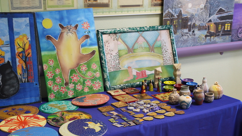 Изделия, выполненные в технике батик, декупаж, роспись и резьба по дереву украшают фойе нашего техникума.