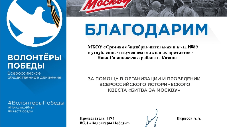 Благодарность за помощь в организации и проведении Всероссийского исторического квеста "Битва за Москву"