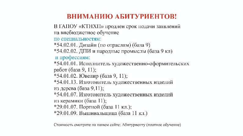 В ГАПОУ "КТНХП" продлен срок приема документов абитуриентов на внебюджетной основе до 25 ноября 2020 года.