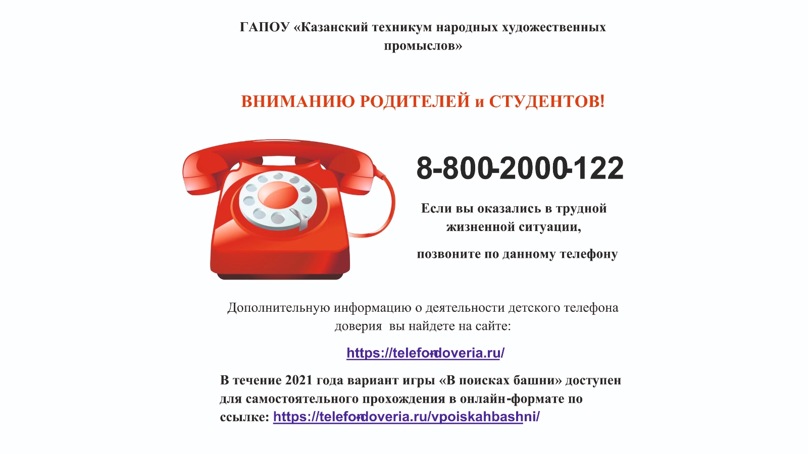 С 2010 года в Республике Татарстан функционирует детский телефон доверия с единым общероссийским номером 8 800 2000 122