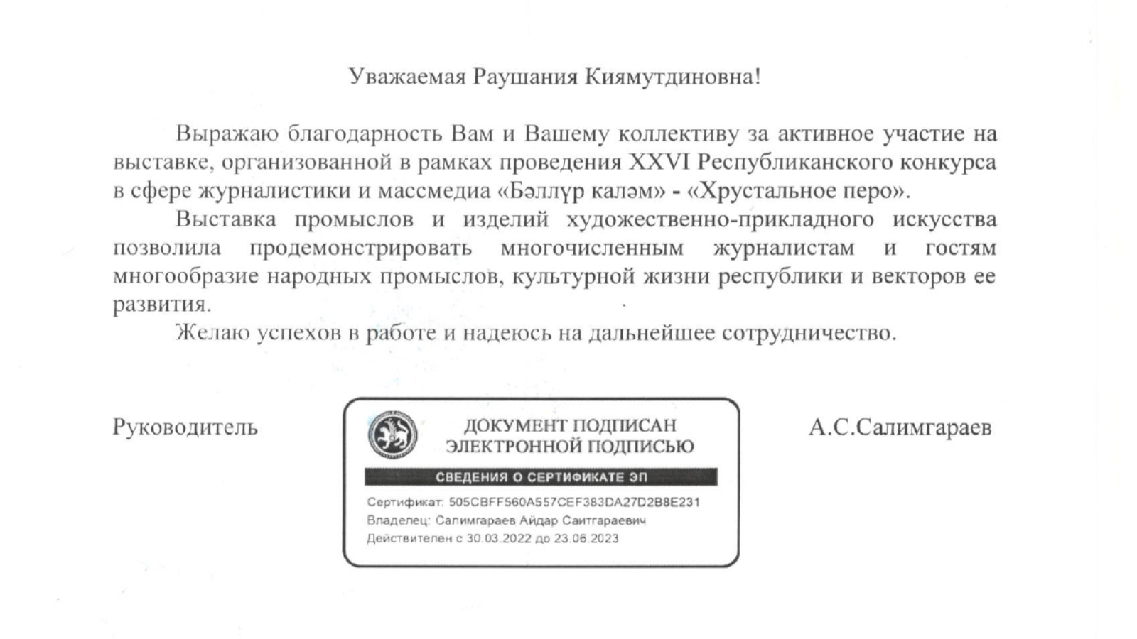Руководитель Республиканского агентства по печати и массовым коммуникациям А.С. Салимгараев выражает свою благодарность директору и коллективу ГАПОУ «Казанский техникум народных художественных промыслов» за активное участие на выставке, организованной в рамках проведения XXVI Республиканского конкурса в сфере журналистики и массмедиа “Бәллүр каләм”-“Хрустальное перо”.