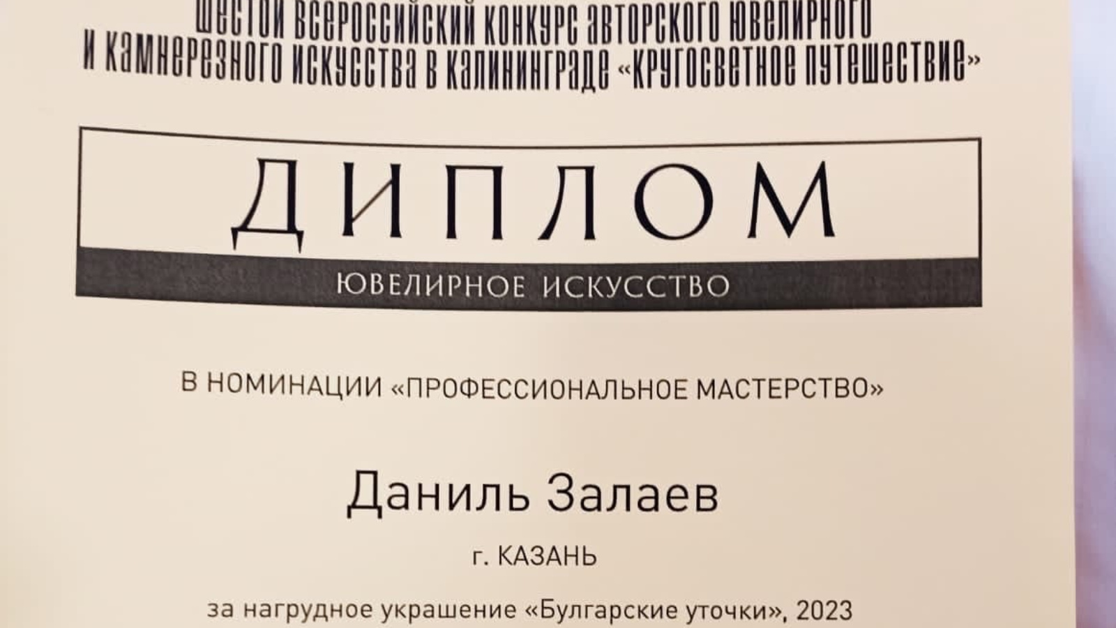 В 2023 году в г. Калининград состоялся VI Всероссийский конкурс авторского ювелирного и камнерезного искусства «Кругосветное путешествие». В номинации «Профессиональное мастерство» дипломом отмечена работа «Булгарские уточки» нашего преподавателя, мастера производственного обучения Даниля Рафкатовича Залаева! Поздравляем и желаем дальнейших творческих успехов.