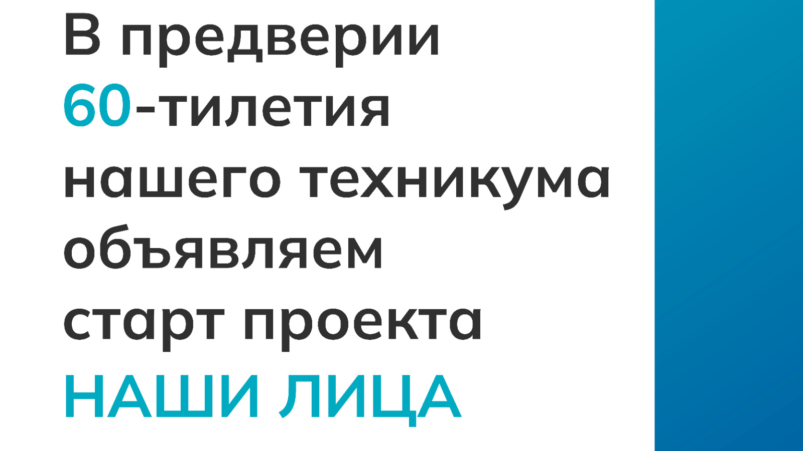 В преддверии большого праздниак - 60-ти летнего юбилея техникума, стартует проект "Наши лица", который поможет лучше узнать наших руководителей и преподавтелей.