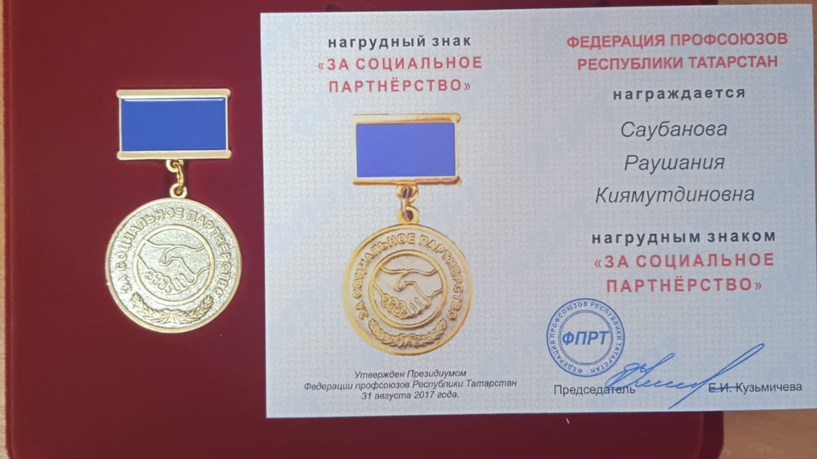 Директор Казанского техникума народных художественных промыслов Р.К. Саубанова награждена нагрудным знаком «За социальное партнерство», утвержденным Президиумом Федерации профсоюзов Республики Татарстан.