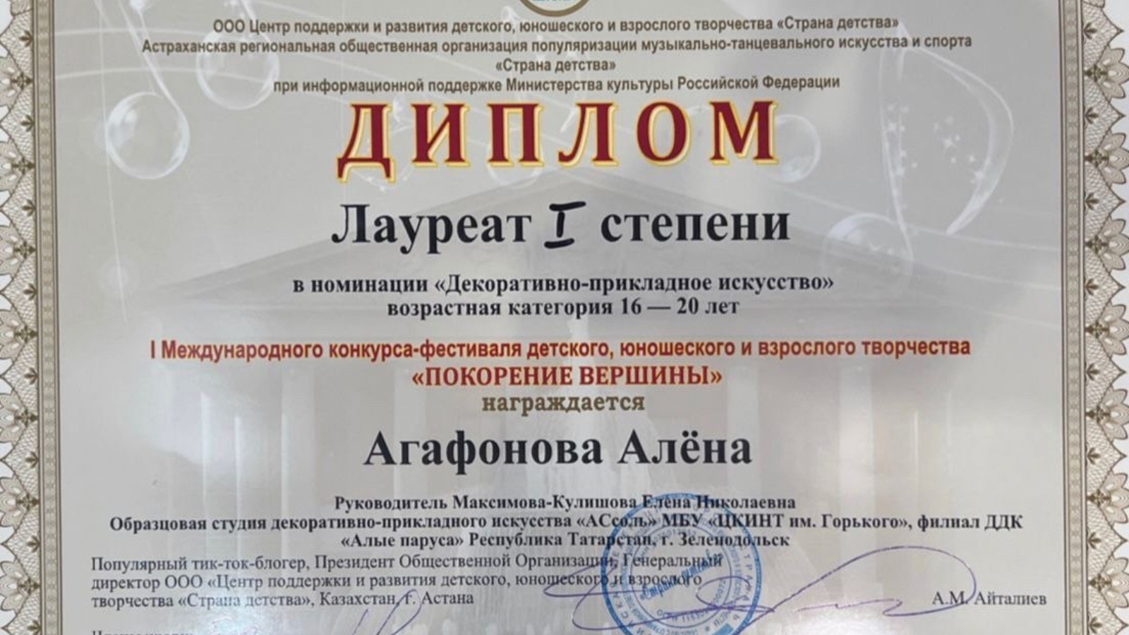 Студентка первого курса гр. 568 Д/9 Агафонова Алëна приняла участие в международном конкурсе «Покорение вершин» в г. Улан-Удэ. В номинации ДПИ заняла лауреат 1 степени.