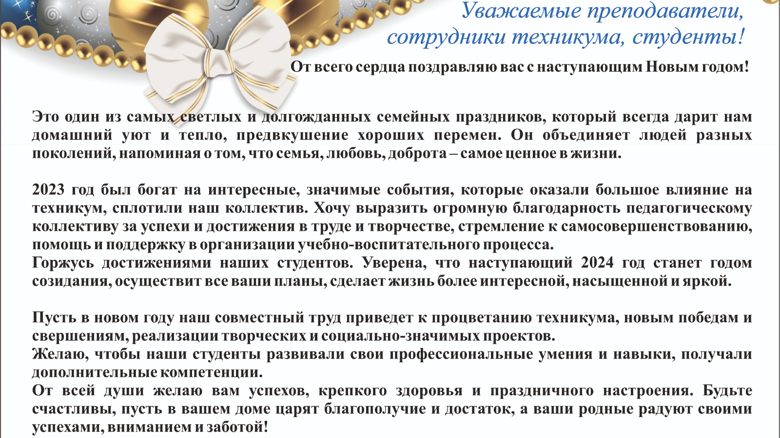 Подводя итоги уходящего 2023 года, директор ГАПОУ "Казанский техникум народных художественных промыслов" Р.К.Саубанова, выразила слова благодарности педагогическому коллективу, сотрудникам и студентам техникума. Пожелала успехов в реализации творческих планов и крепкого здоровья!