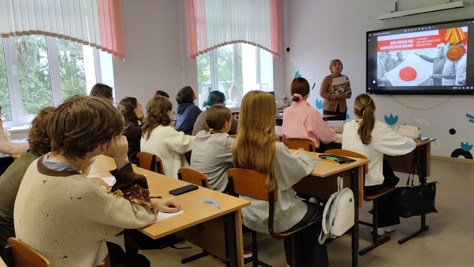 Для студентов советником директора по воспитанию Э.А.Яруллиной были организованы тематические мероприятия, чтобы вспомнить героизм и мужество советских воинов, завершивших разгром нацизма и его союзников на Дальнем Востоке. В этот день проведены информационные уроки с показом презентаций и видеофильмов.
